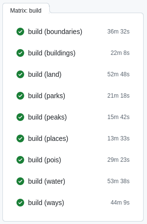 To avoid being killed by the OOM killer, I build the map in thematic layers. GitHub, to its credit, lets you use up to 20 runners simultaneously. So even though the total amount of CPU used is more, the wall-clock time is dictated by whichever of your layers is slowest: